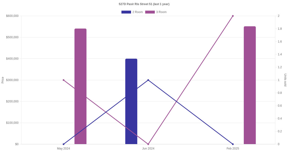 Below is a quick summary of the resale transactions volume and average price trends for the 2 room and 3 room units at 527D Pasir Ris Street 51.