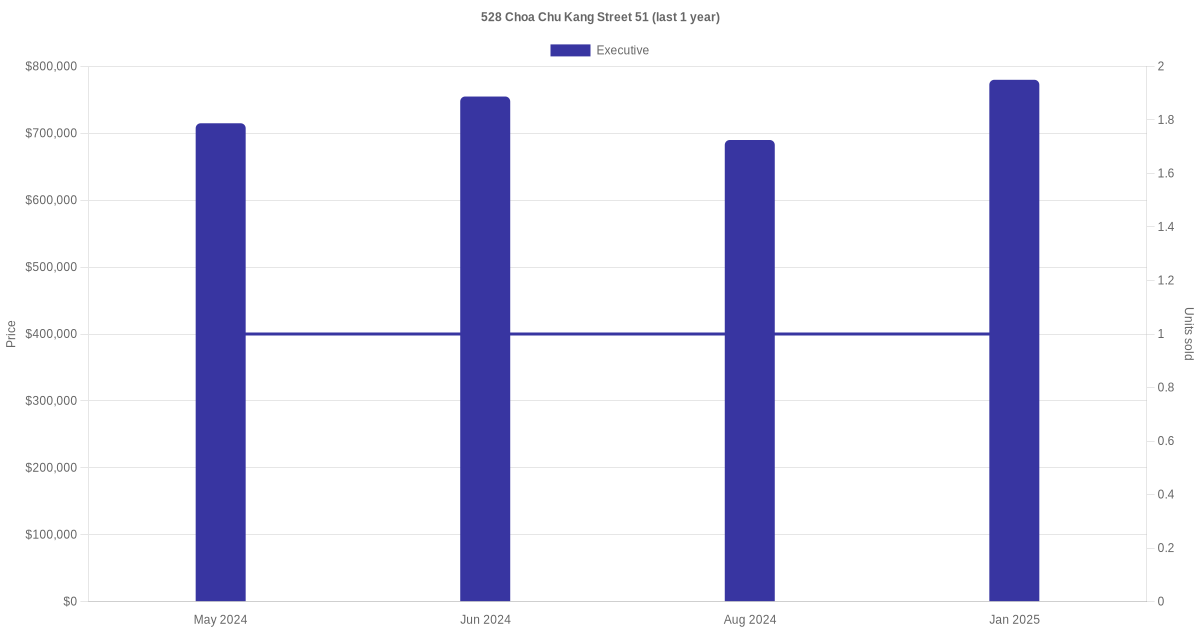There were a total of 5 resale transactions in the last 3 years for units in block 528 Choa Chu Kang Street 51, with the latest one recorded in Jan 2025.