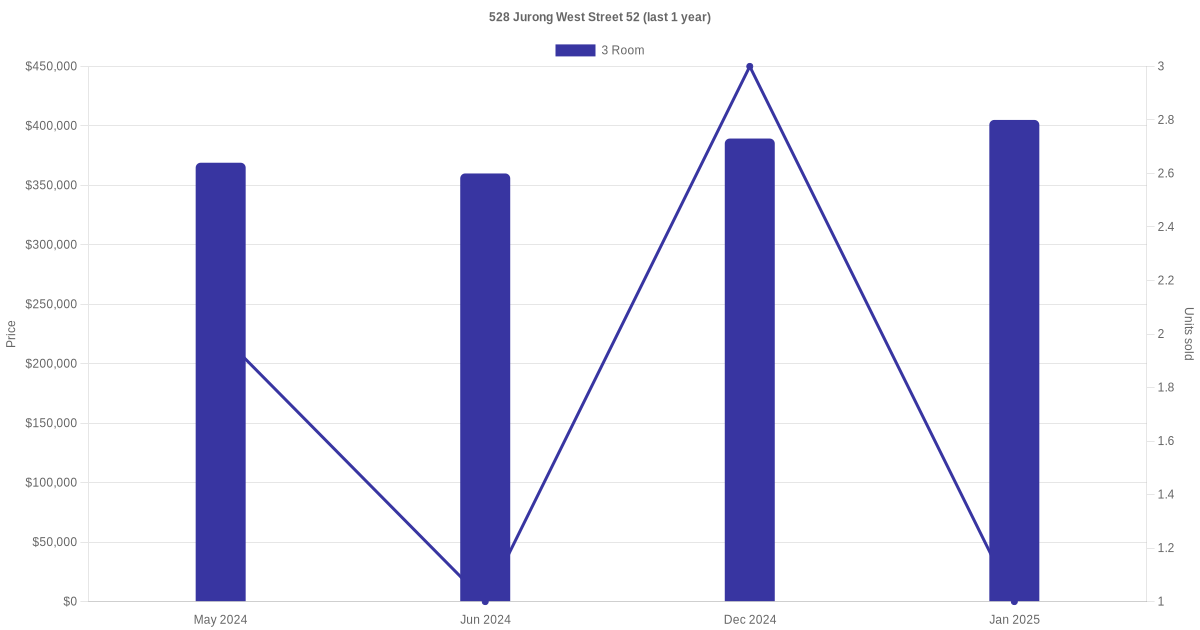 Below is a quick summary of the resale transactions volume and average price trends for the 3 room and 4 room units at 528 Jurong West Street 52.
