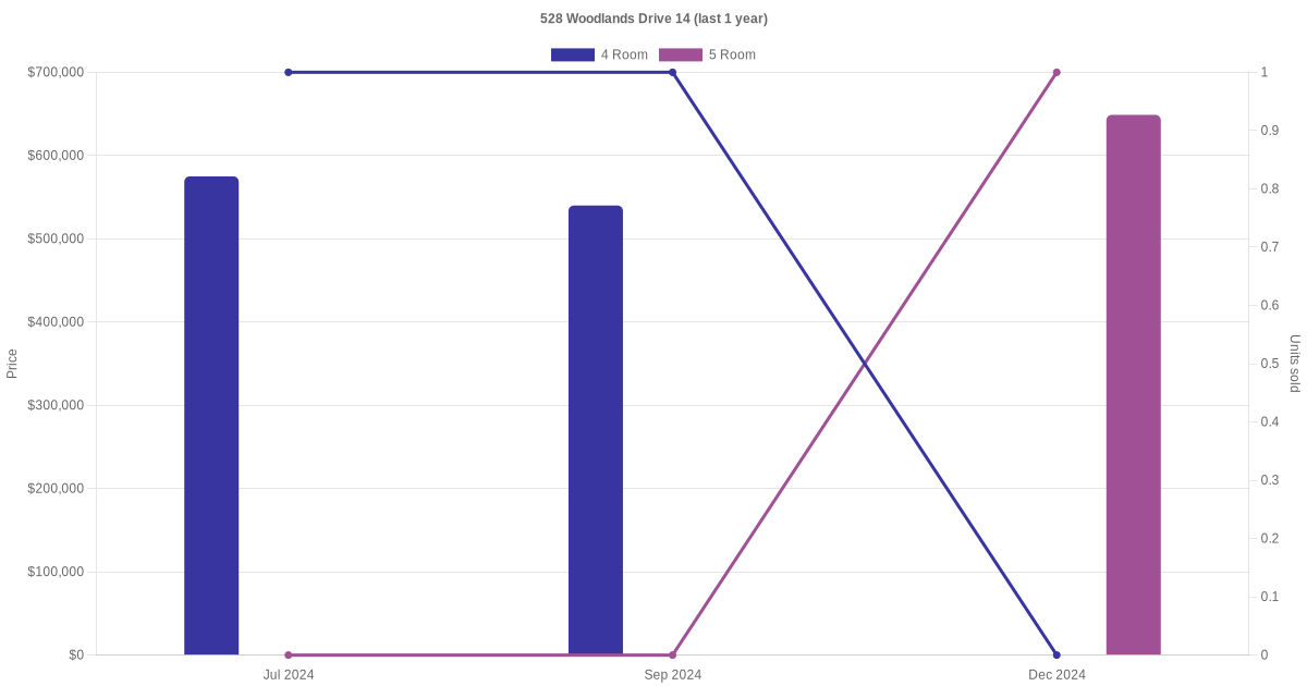 Below is a quick summary of the resale transactions volume and average price trends for the 4 room and 5 room units at 528 Woodlands Drive 14.