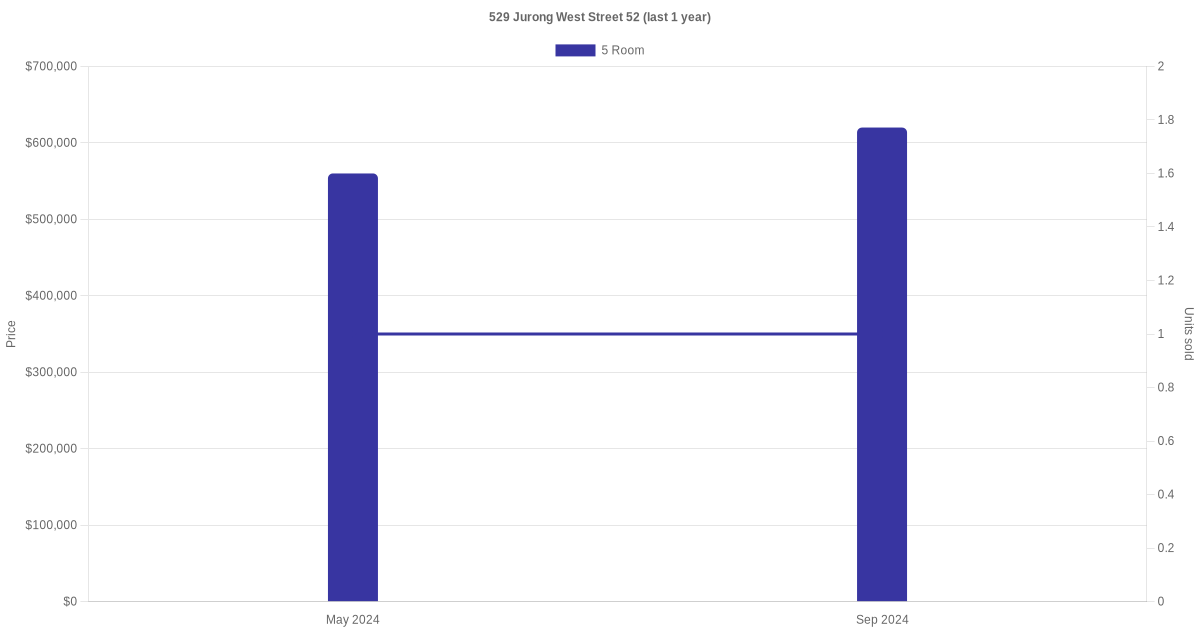 Below is a quick summary of the resale transactions volume and average price trends for the 5 room units at 529 Jurong West Street 52.
