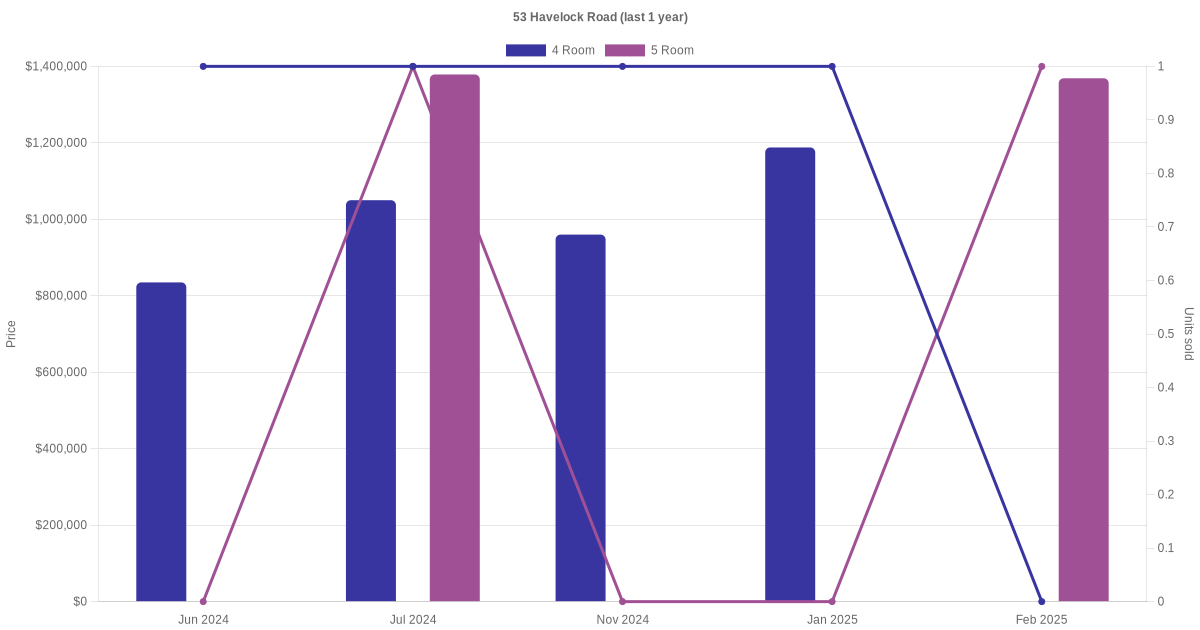 Below is a quick summary of the resale transactions volume and average price trends for the 4 room and 5 room units at 53 Havelock Road.