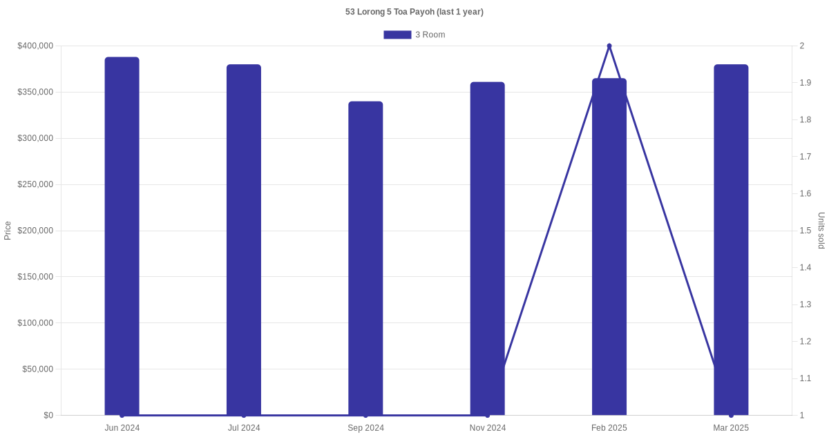 Below is a quick summary of the resale transactions volume and average price trends for the 3 room units at 53 Lorong 5 Toa Payoh.
