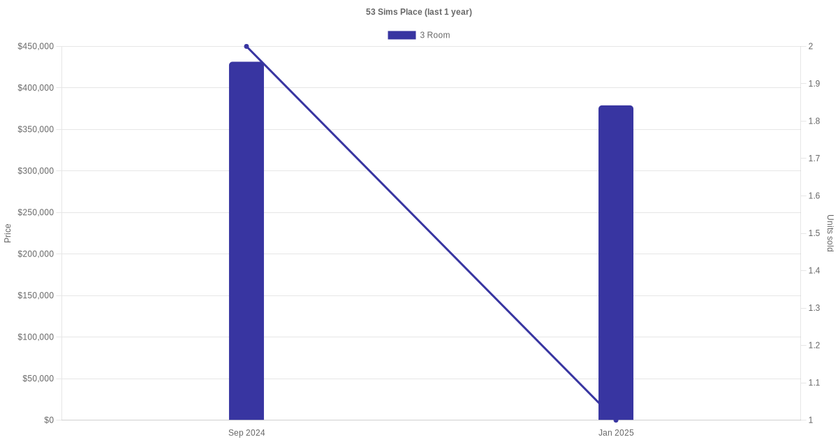 Below is a quick summary of the resale transactions volume and average price trends for the 3 room units at 53 Sims Place.
