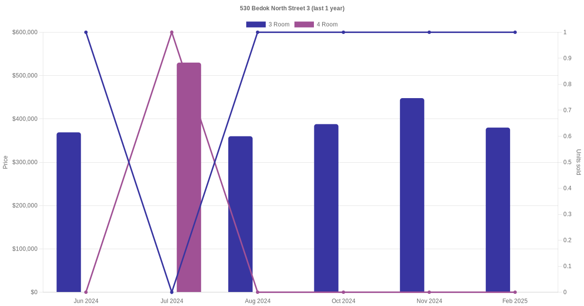 Below is a quick summary of the resale transactions volume and average price trends for the 3 room and 4 room units at 530 Bedok North Street 3.