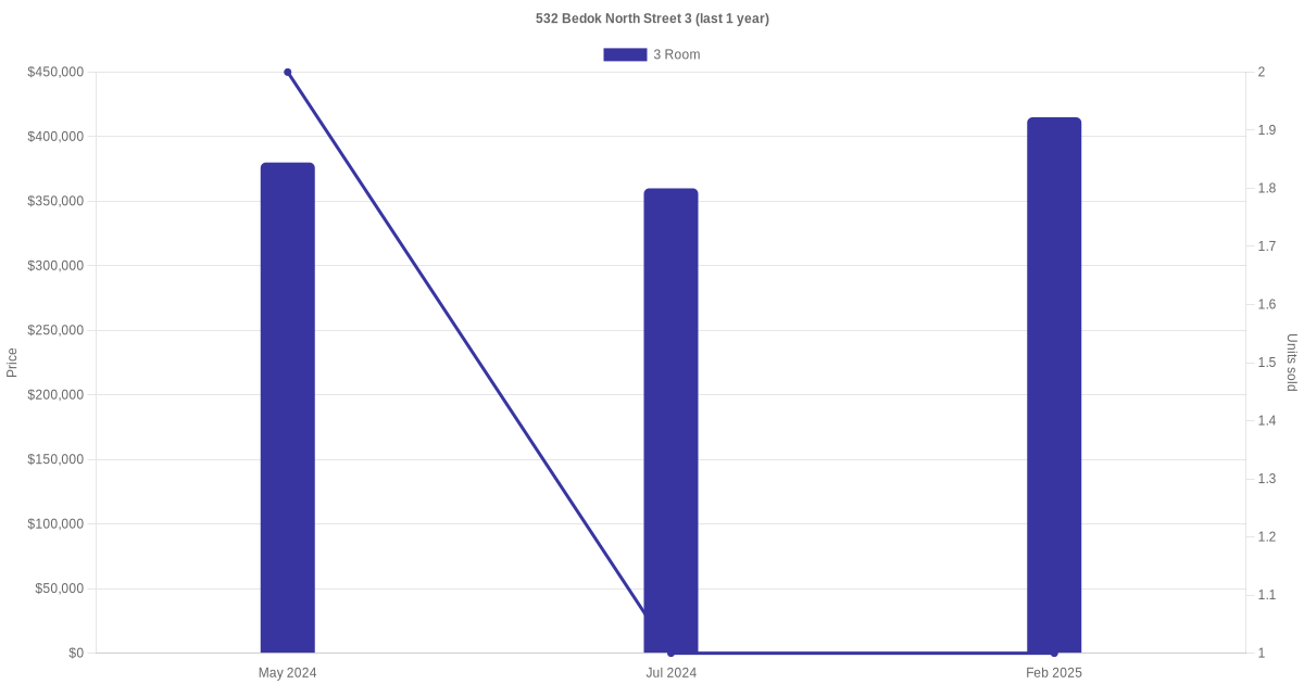 Below is a quick summary of the resale transactions volume and average price trends for the 3 room and 4 room units at 532 Bedok North Street 3.