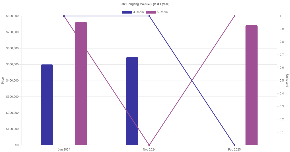 Below is a quick summary of the resale transactions volume and average price trends for the 4 room and 5 room units at 532 Hougang Avenue 6.