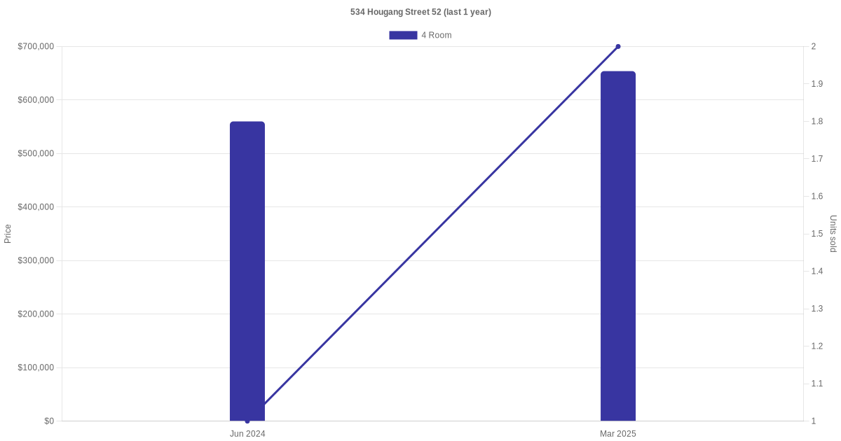Below is a quick summary of the resale transactions volume and average price trends for the 4 room units at 534 Hougang Street 52.