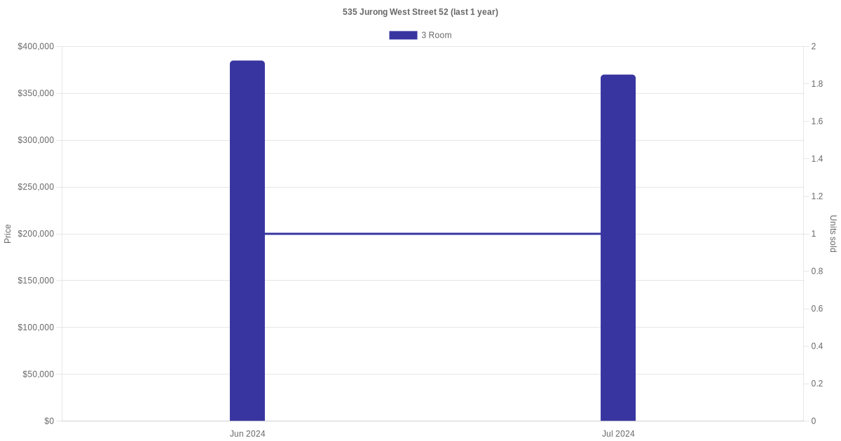 Below is a quick summary of the resale transactions volume and average price trends for the 3 room and 4 room units at 535 Jurong West Street 52.