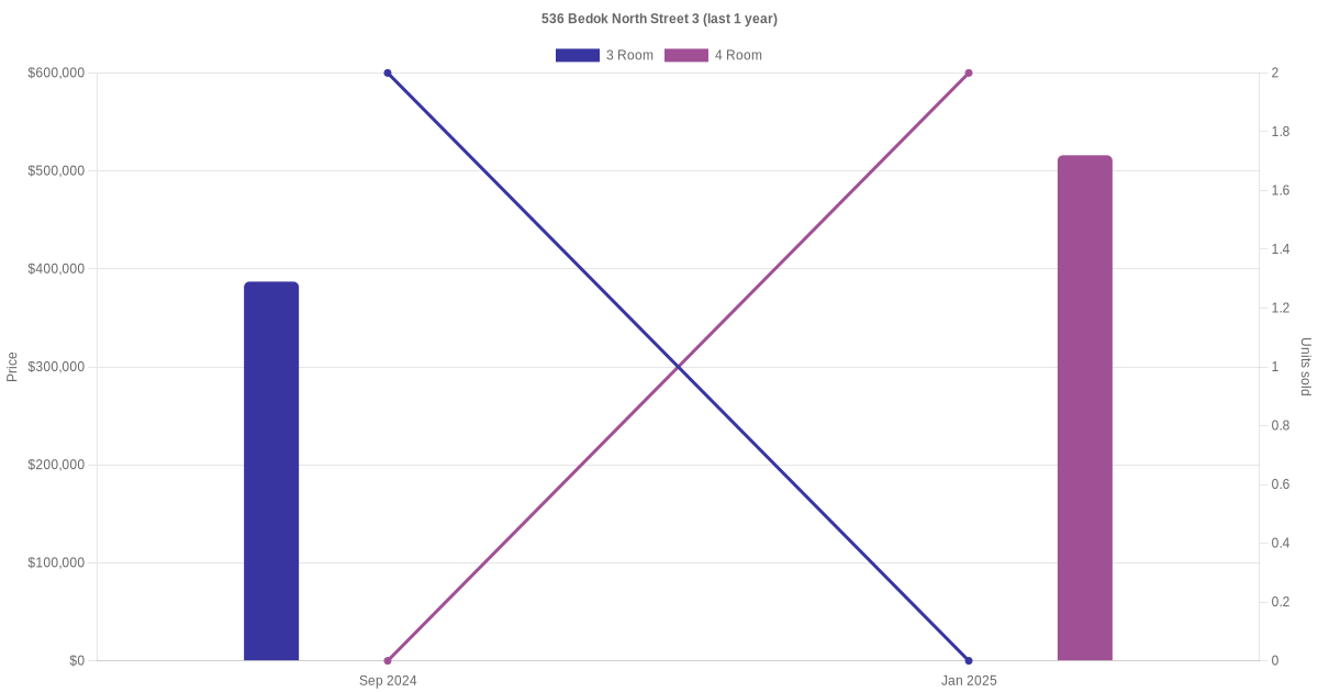 Below is a quick summary of the resale transactions volume and average price trends for the 3 room and 4 room units at 536 Bedok North Street 3.