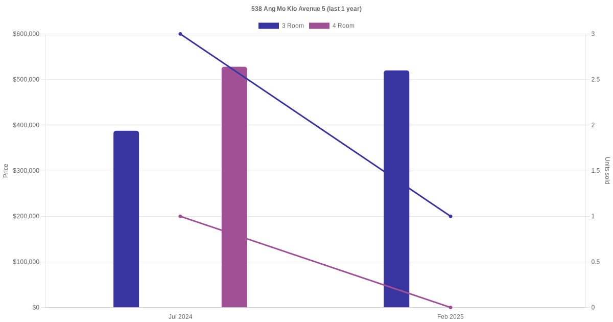 Below is a quick summary of the resale transactions volume and average price trends for the 3 room and 4 room units at 538 Ang Mo Kio Avenue 5.