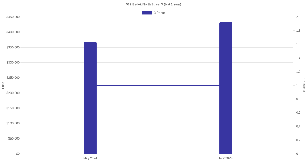 Below is a quick summary of the resale transactions volume and average price trends for the 3 room units at 539 Bedok North Street 3.