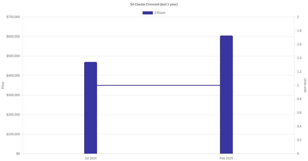 There were a total of 6 resale transactions in the last 3 years for units in block 54 Cassia Crescent, with the latest one recorded in Sep 2025.