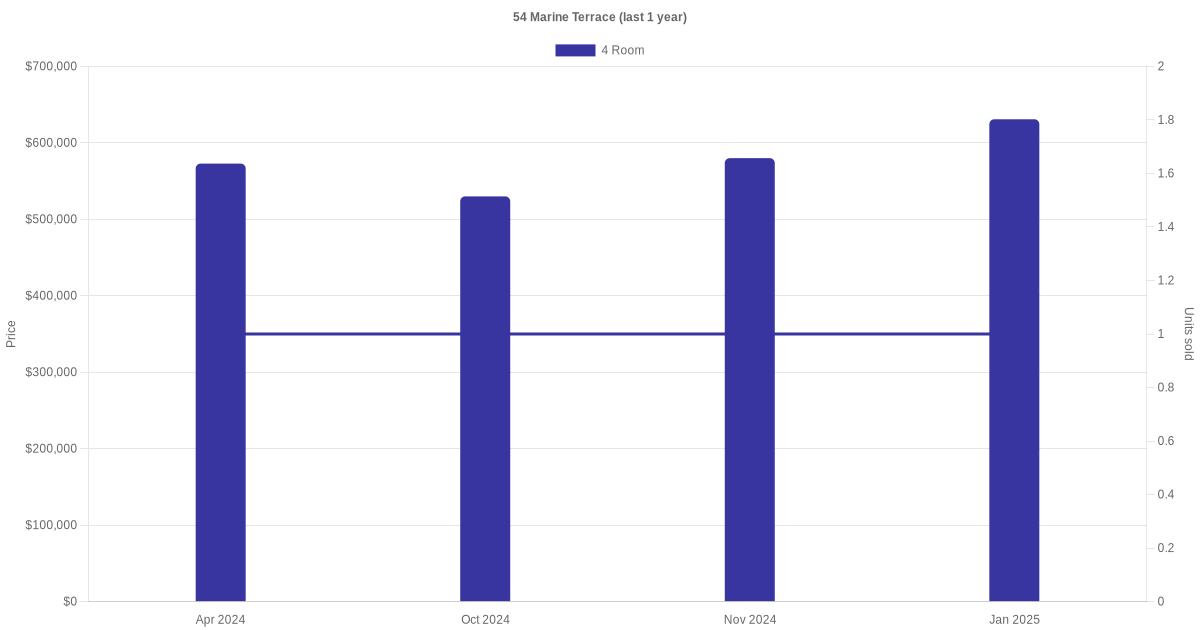Below is a quick summary of the resale transactions volume and average price trends for the 4 room units at 54 Marine Terrace.