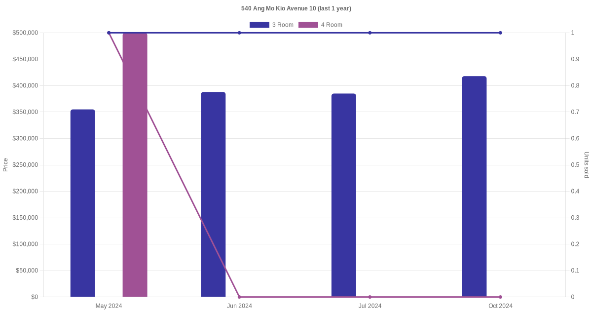Below is a quick summary of the resale transactions volume and average price trends for the 3 room and 4 room units at 540 Ang Mo Kio Avenue 10.