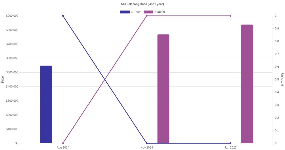 Below is a quick summary of the resale transactions volume and average price trends for the 4 room and 5 room units at 540 Jelapang Road.