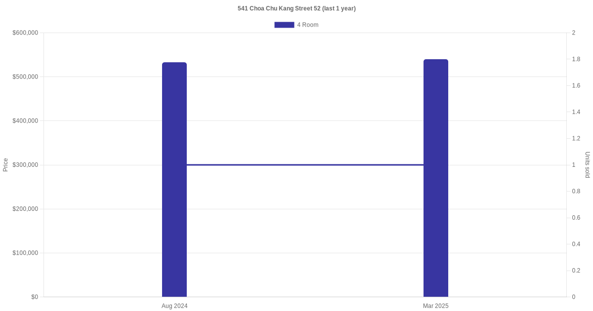 There were a total of 4 resale transactions in the last 3 years for units in block 541 Choa Chu Kang Street 52, with the latest one recorded in Apr 2025.