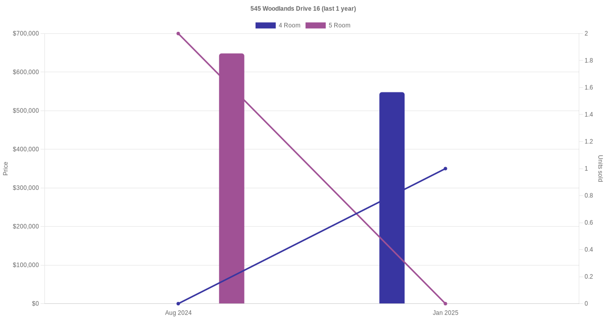 Below is a quick summary of the resale transactions volume and average price trends for the 4 room and 5 room units at 545 Woodlands Drive 16.