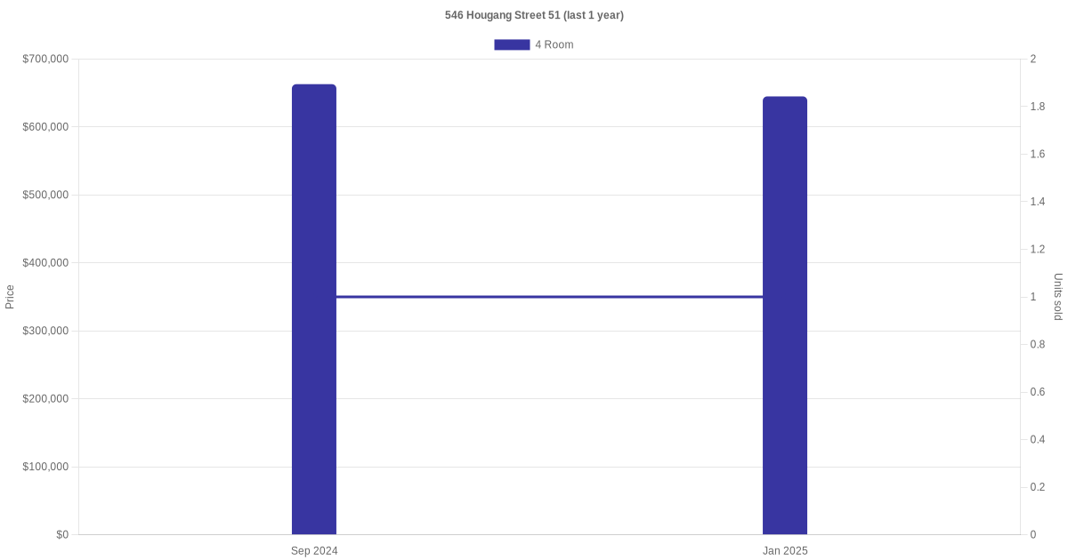 Below is a quick summary of the resale transactions volume and average price trends for the 4 room units at 546 Hougang Street 51.