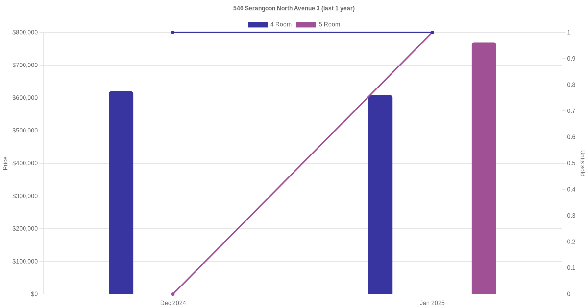Below is a quick summary of the resale transactions volume and average price trends for the 4 room and 5 room units at 546 Serangoon North Avenue 3.