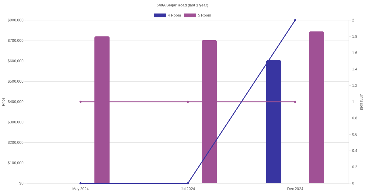 Below is a quick summary of the resale transactions volume and average price trends for the 4 room and 5 room units at 549A Segar Road.