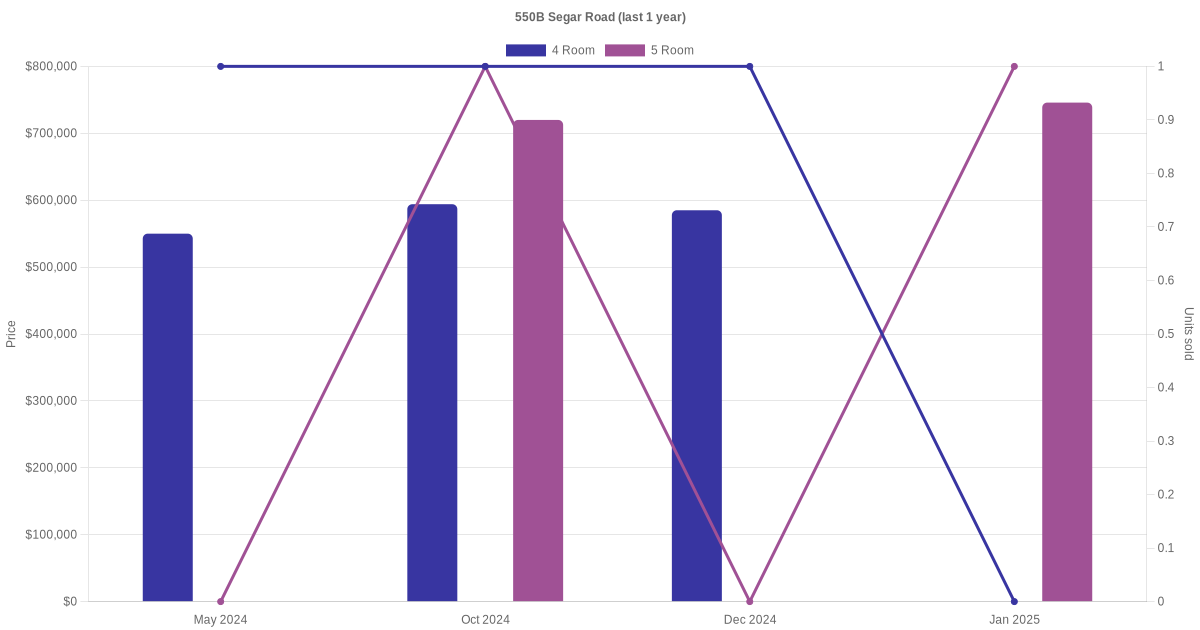 Below is a quick summary of the resale transactions volume and average price trends for the 4 room and 5 room units at 550B Segar Road.