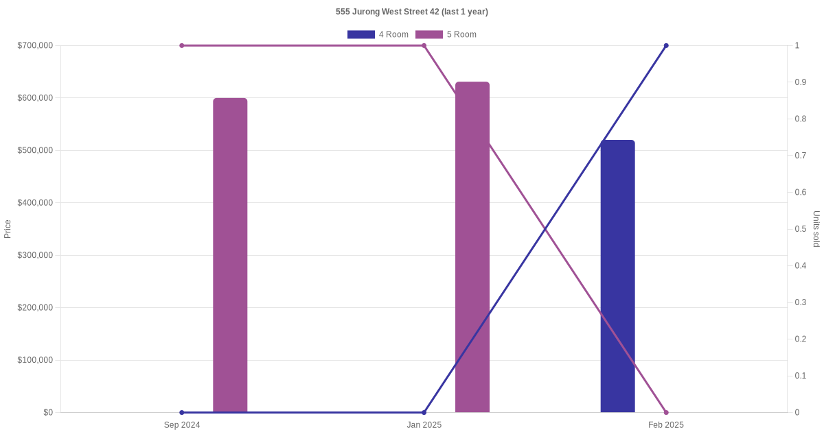 Below is a quick summary of the resale transactions volume and average price trends for the 4 room and 5 room units at 555 Jurong West Street 42.