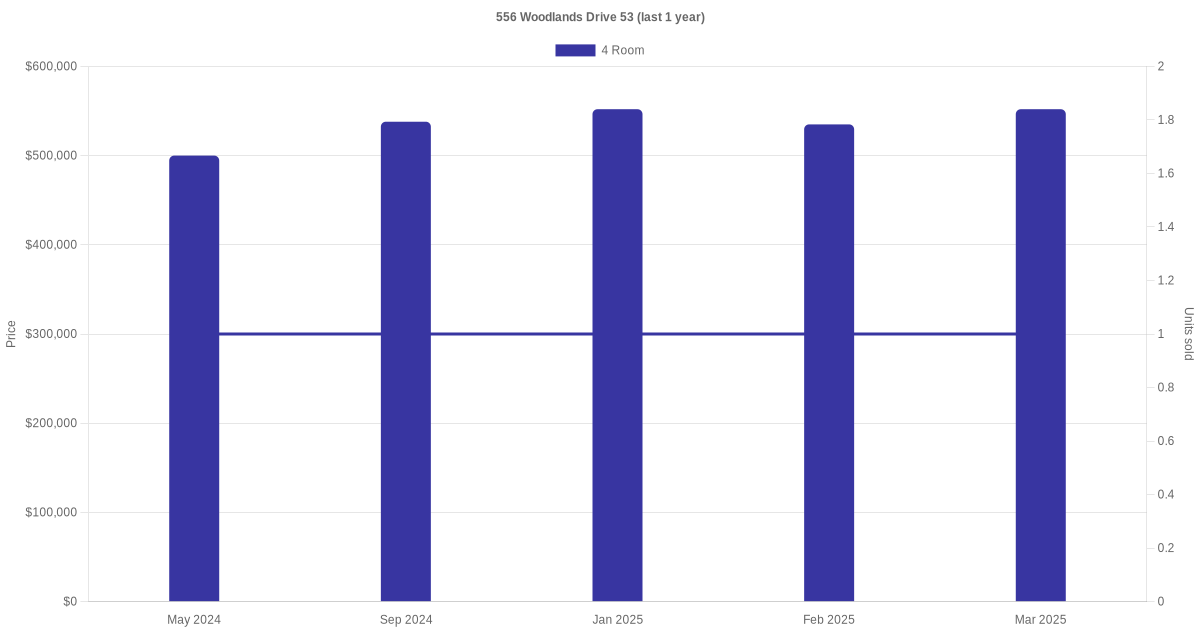 | Mar 2025 | $552,000 | $5,520 | 4 Room | Blk 556 Woodlands Drive 53 4 Room / 100 sqm | 07 to 09 | 100 sqm | Model A | 1999 |