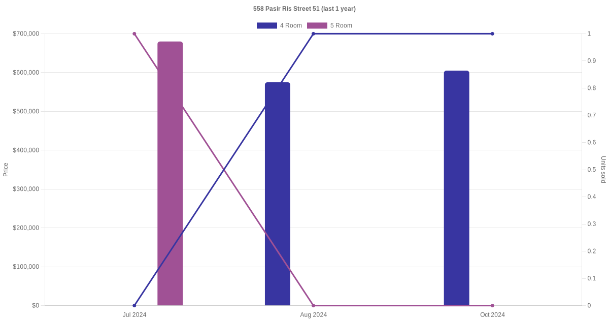 Below is a quick summary of the resale transactions volume and average price trends for the 4 room and 5 room units at 558 Pasir Ris Street 51.