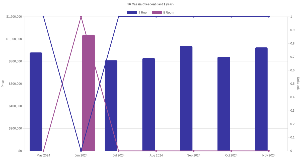 Below is a quick summary of the resale transactions volume and average price trends for the 4 room and 5 room units at 56 Cassia Crescent.