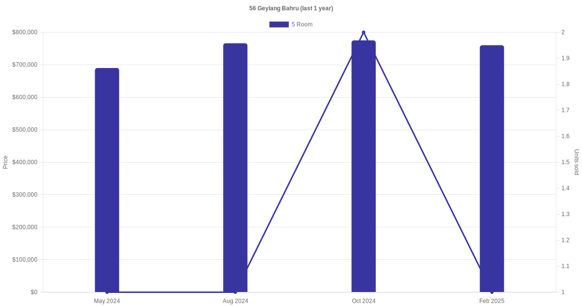 Below is a quick summary of the resale transactions volume and average price trends for the 5 room units at 56 Geylang Bahru.