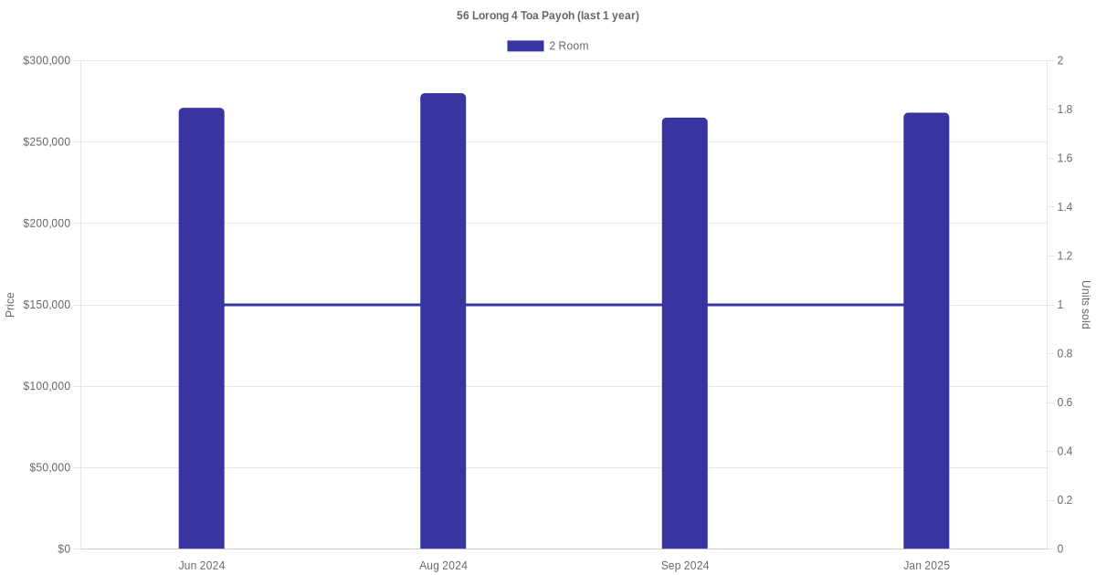 | Aug 2024 | $280,000 | $6,667 | 2 Room | Blk 56 Lorong 4 Toa Payoh 2 Room / 42 sqm | 01 to 03 | 42 sqm | Standard | 1967 |