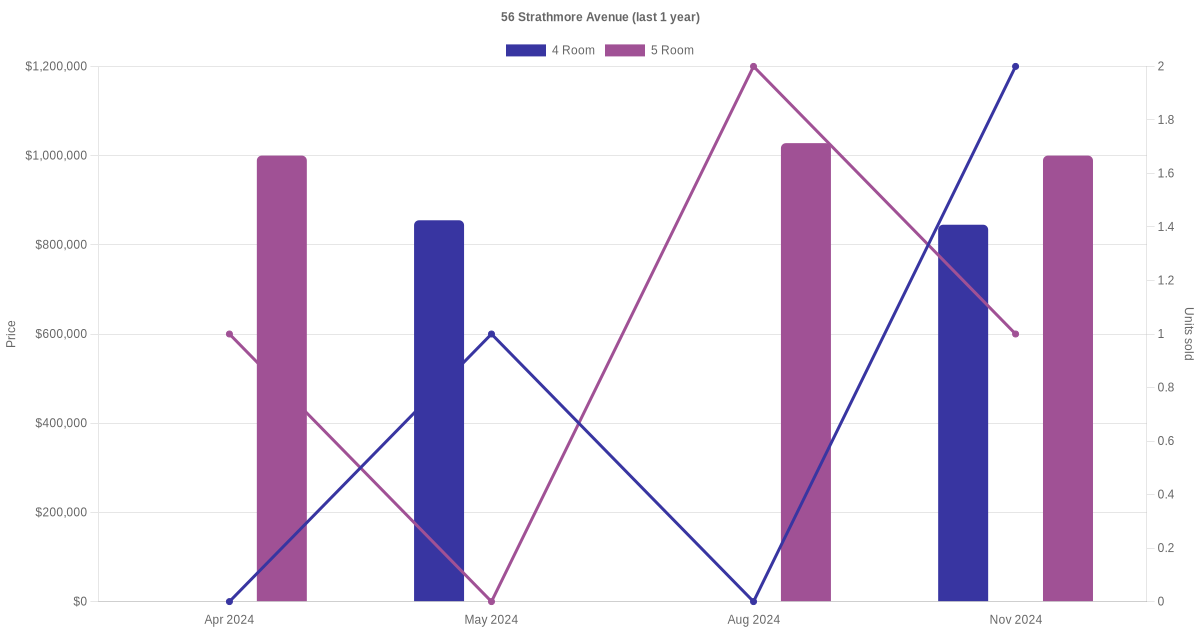 Below is a quick summary of the resale transactions volume and average price trends for the 4 room and 5 room units at 56 Strathmore Avenue.