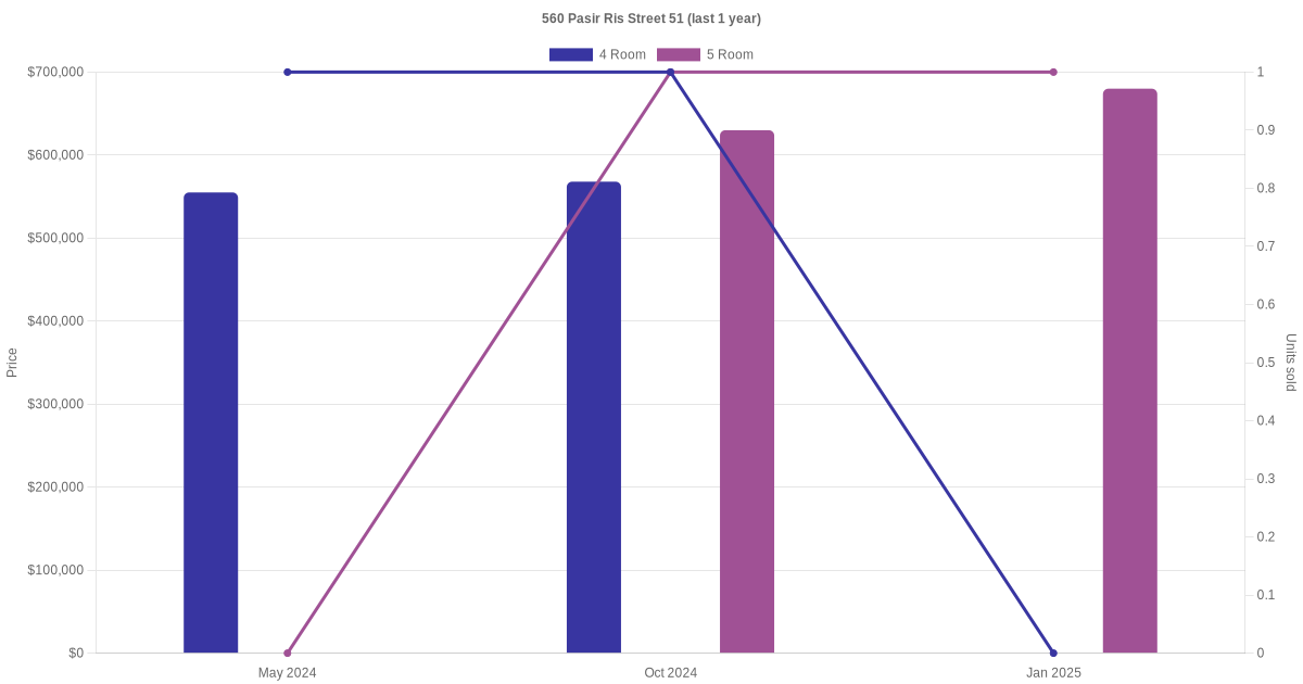 Below is a quick summary of the resale transactions volume and average price trends for the 4 room and 5 room units at 560 Pasir Ris Street 51.
