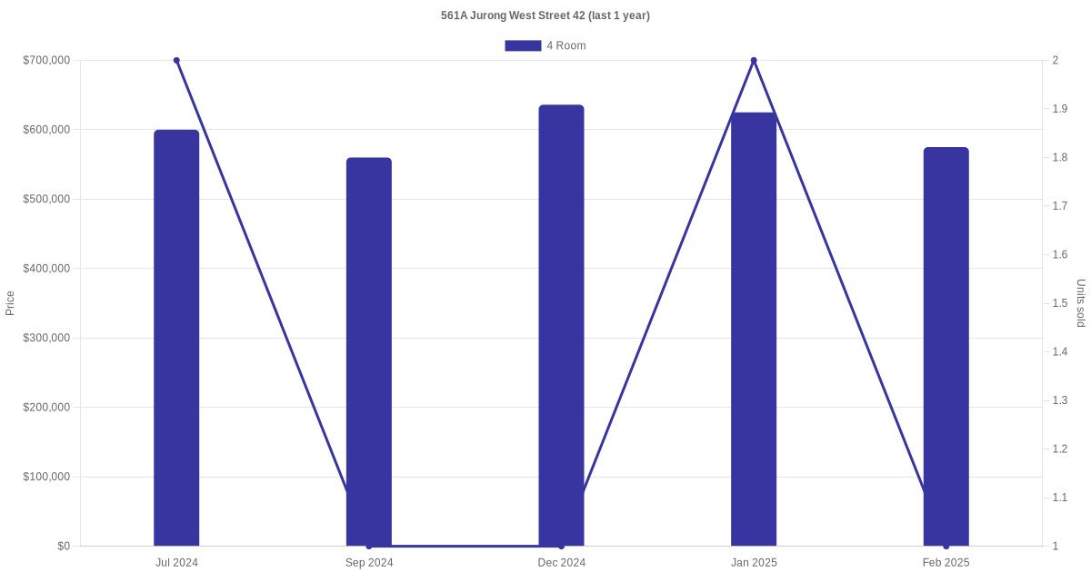 There were a total of 26 resale transactions in the last 3 years for units in block 561A Jurong West Street 42, with the latest one recorded in Dec 2025.