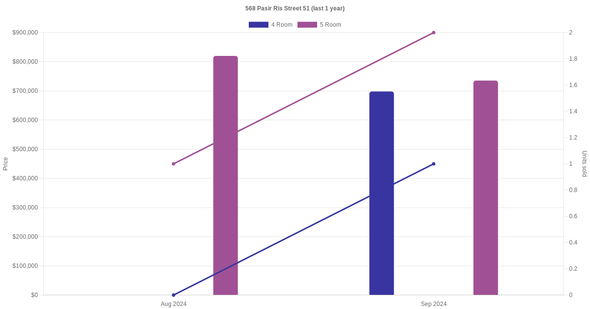 Below is a quick summary of the resale transactions volume and average price trends for the 4 room and 5 room units at 568 Pasir Ris Street 51.