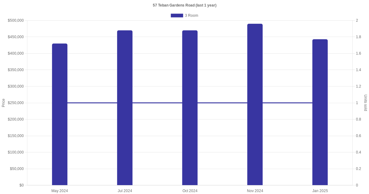 There were a total of 21 resale transactions in the last 3 years for units in block 57 Teban Gardens Road, with the latest one recorded in Jan 2026.