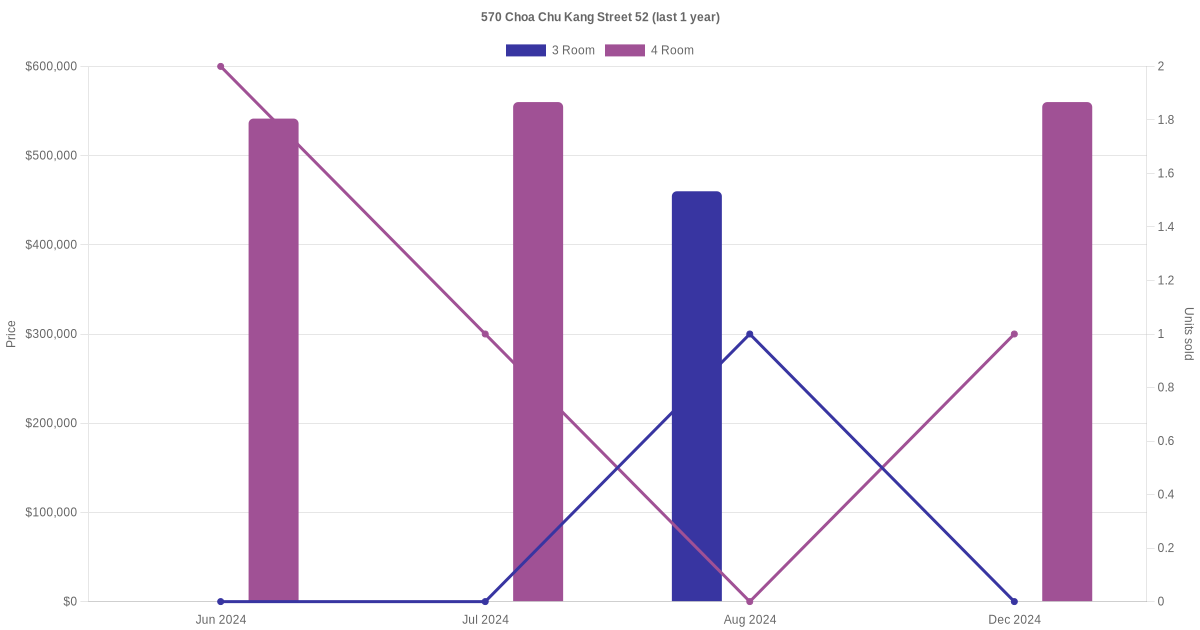 Below is a quick summary of the resale transactions volume and average price trends for the 3 room and 4 room units at 570 Choa Chu Kang Street 52.
