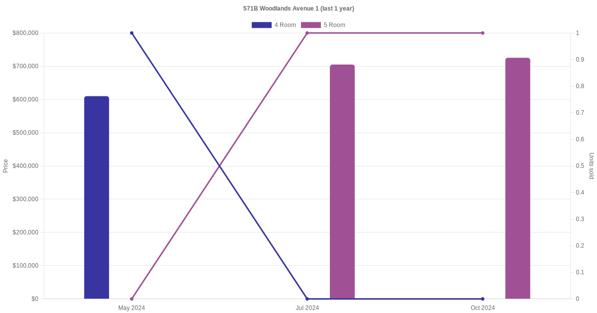 Below is a quick summary of the resale transactions volume and average price trends for the 4 room and 5 room units at 571B Woodlands Avenue 1.