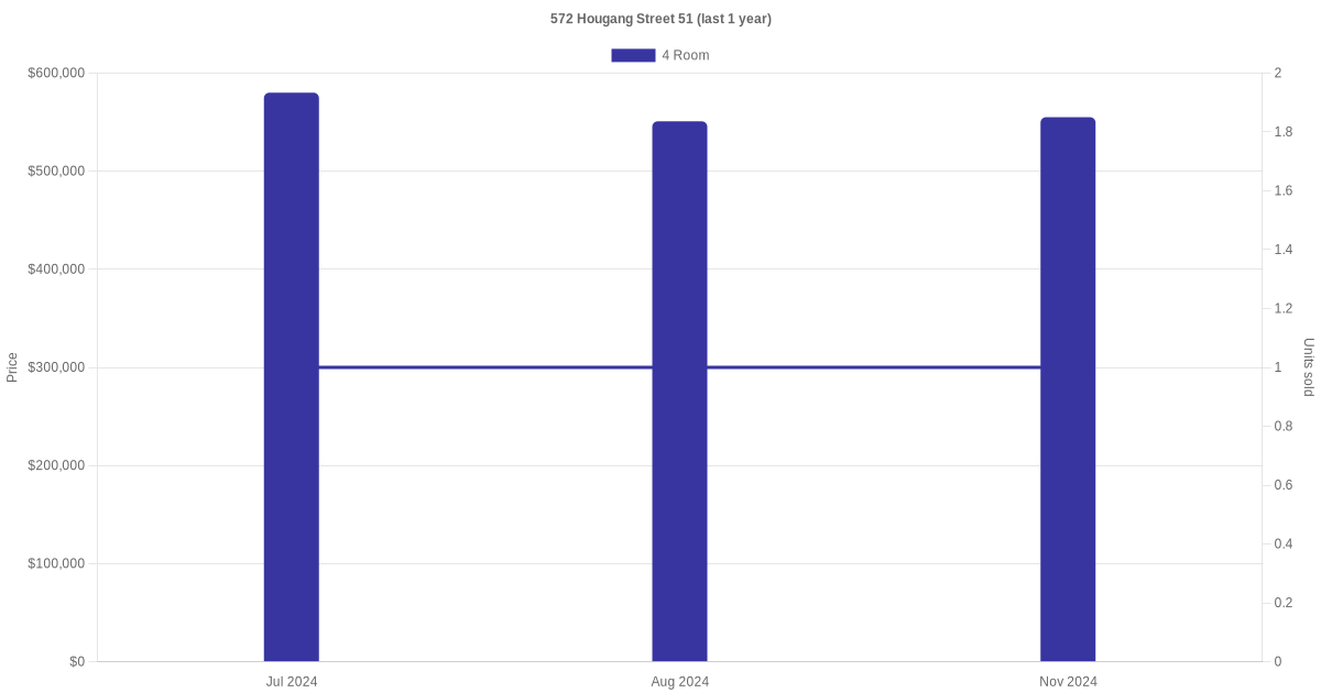 | Nov 2024 | $555,000 | $5,495 | 4 Room | Blk 572 Hougang Street 51 4 Room / 101 sqm | 01 to 03 | 101 sqm | Model A | 1997 |