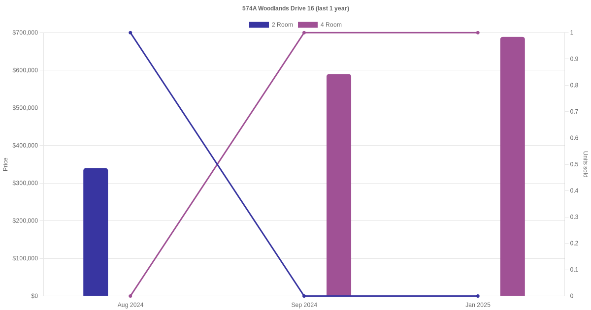Below is a quick summary of the resale transactions volume and average price trends for the 2 room, 3 room and 4 room units at 574A Woodlands Drive 16.