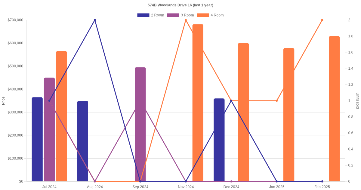 Here's a summary of the rental transactions and price trends for the 2 room, 3 room and 4 room units at 574B Woodlands Drive 16.
