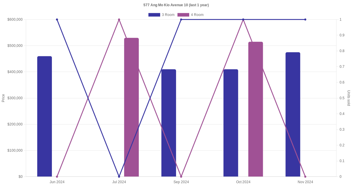 Below is a quick summary of the resale transactions volume and average price trends for the 3 room and 4 room units at 577 Ang Mo Kio Avenue 10.