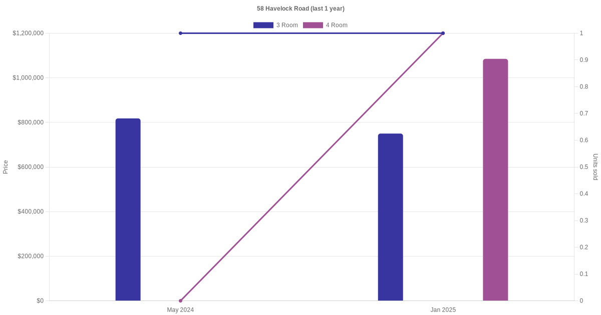 Below is a quick summary of the resale transactions volume and average price trends for the 3 room and 4 room units at 58 Havelock Road.