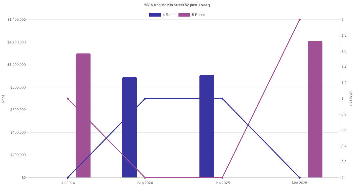 Below is a quick summary of the resale transactions volume and average price trends for the 4 room and 5 room units at 588A Ang Mo Kio Street 52.