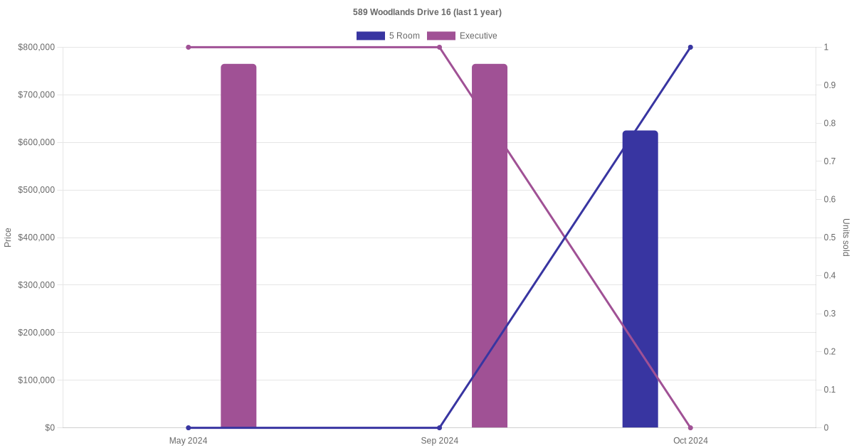 Below is a quick summary of the resale transactions volume and average price trends for the 5 room and executive units at 589 Woodlands Drive 16.