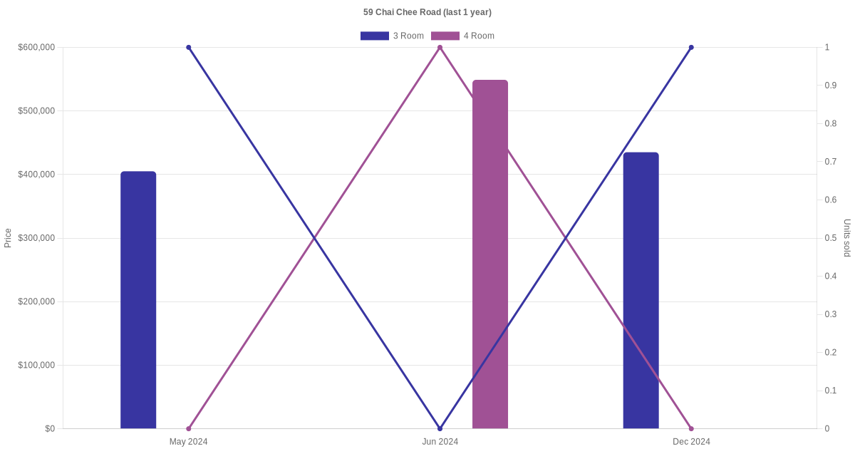 Below is a quick summary of the resale transactions volume and average price trends for the 3 room and 4 room units at 59 Chai Chee Road.