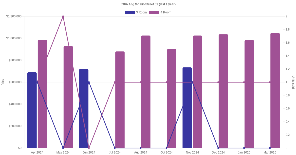 Below is a quick summary of the resale transactions volume and average price trends for the 3 room and 4 room units at 590A Ang Mo Kio Street 51.