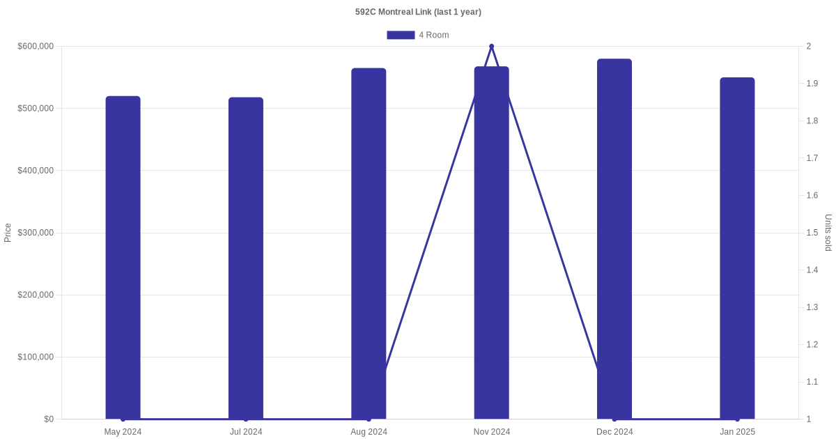 Below is a quick summary of the resale transactions volume and average price trends for the 4 room units at 592C Montreal Link.