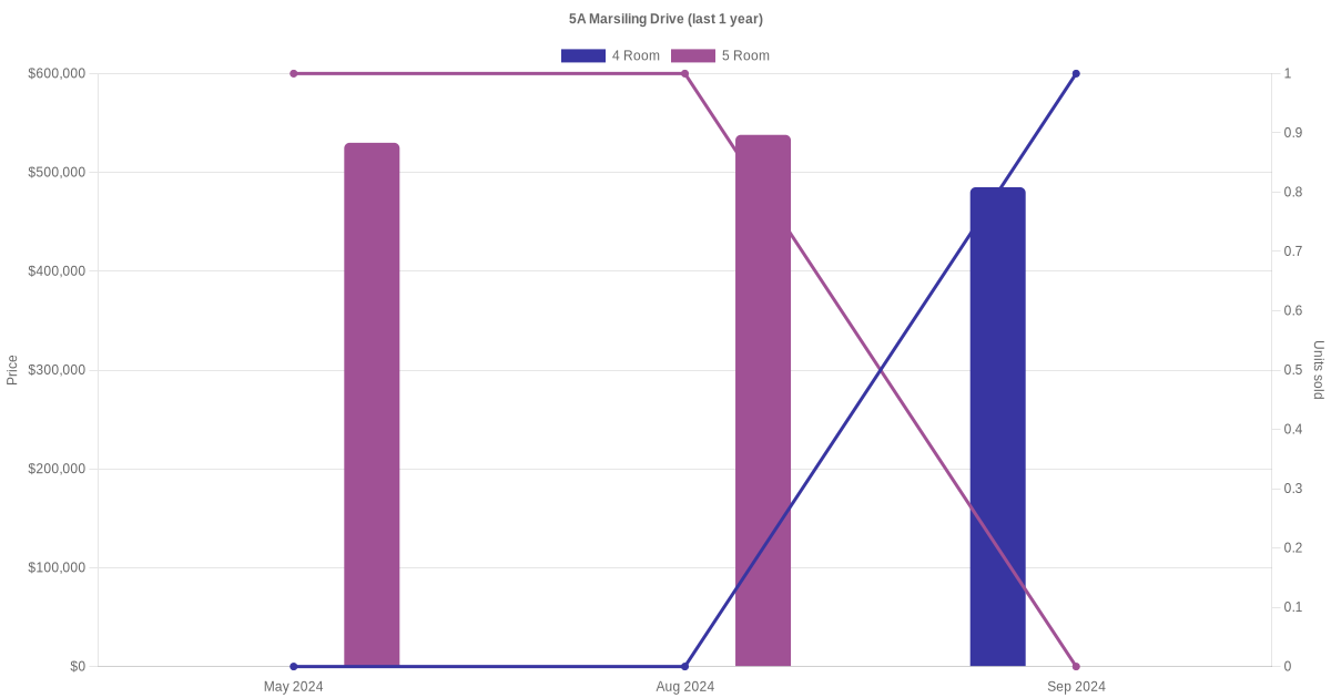 Below is a quick summary of the resale transactions volume and average price trends for the 4 room and 5 room units at 5A Marsiling Drive.